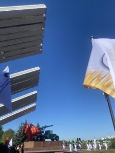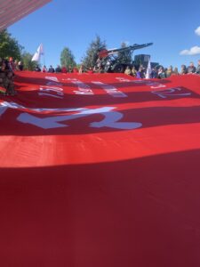 Возле монумента легендарной боевой машины БМ-13, которую впоследствии стали ласково называть «катюша», участники митинга развернули масштабную копию Знамени Победы, а также исполнили одноименную песню.